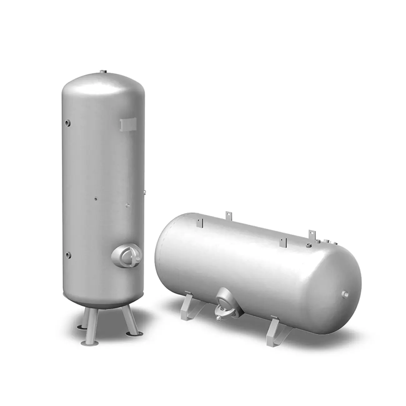 Druckluftbehälter speichern die vom Kompressor erzeugte komprimierte Luft und geben sie bei Bedarf wieder ab. So gleichen sie schwankenden Druckluftbedarf aus und reduzieren zudem die Ein- und Ausschaltzyklen des Kompressors bei kurzfristigen Spitzenlasten und senken so die Betriebskosten. Abhängig vom Bedarf und der vorhandenen Aufstellfläche sind stehende und liegende Druckluftbehälter mit einem Volumenspektrum von 90 – 10.000 Liter und einem Maximaldruck von 11 oder 16 bar im Standard verfügbar.