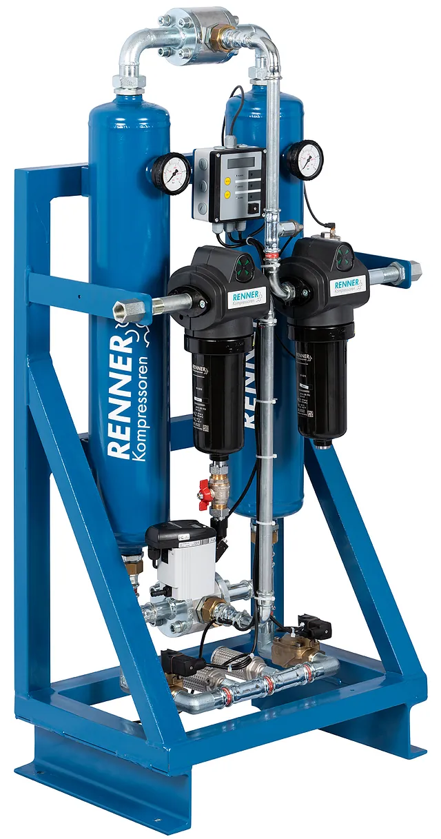 Beim Adsorptionstrockner sind zwei parallel geschaltete Behälter mit hochwertigem Trockenmittel befüllt. In einem Behälter wird der Druckluft die Feuchtigkeit entzogen, damit der gewünschte Drucktaupunkt erreicht wird. Parallel hierzu findet im anderen Behälter die Regeneration (Desorption) des Trockenmittels statt.