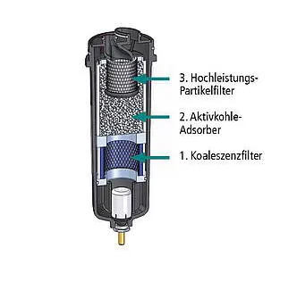 Höchste Druckluftqualität gem. ISO 8573-1 dank der Kombination aus Submikrofilter, Aktivkohleabsorber und Hochleistungs-Partikelfilter