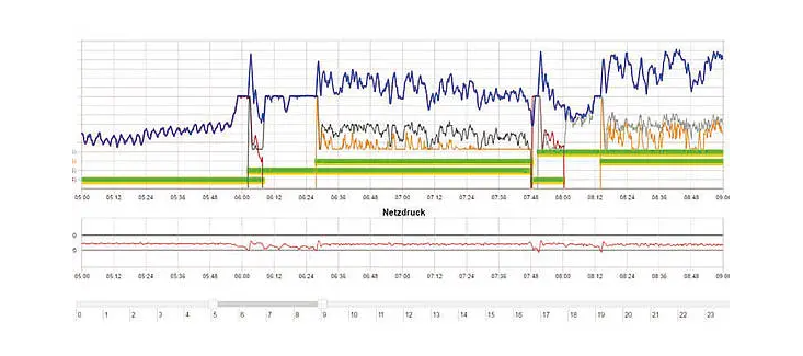 Ein übersichtliches Gesamtdiagramm stellt auf einen Blick Druckverlauf, Volumenstrom sowie die Kompressorlaufzeiten dar.