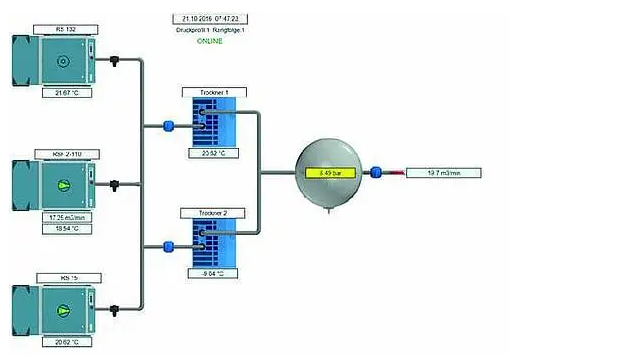 - Steuert und optimiert die Interaktion zwischen Drucklufterzeugung und- verbrauch.