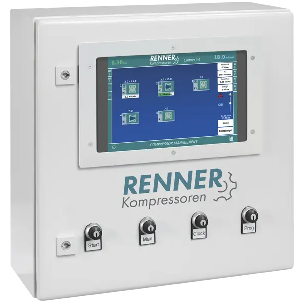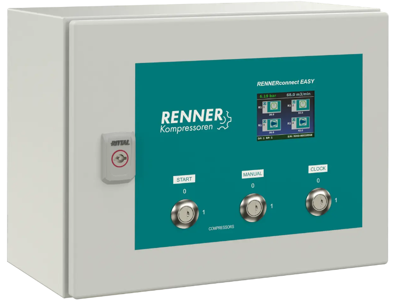 Mit der Einführung der RENNERconnect EASY Steuerung bieten wir Ihnen eine verbrauchsabhängige Kompressorsteuerung, welche bis zu 4 Kompressoren mit dem gewohnten Funktionsumfang der bereits vorhanden RENNERconnect Steuerung, gleichzeitig steuern kann. Sie zeichnet sich durch hohe Wirtschaftlichkeit und Zuverlässigkeit aus. Durch intelligentes, verbrauchsabhängiges Zuschalten der Kompressoren erschließen Sie nicht nur große Energieeinsparpotenziale, sondern erhöhen auch die Betriebssicherheit Ihrer Maschinen.