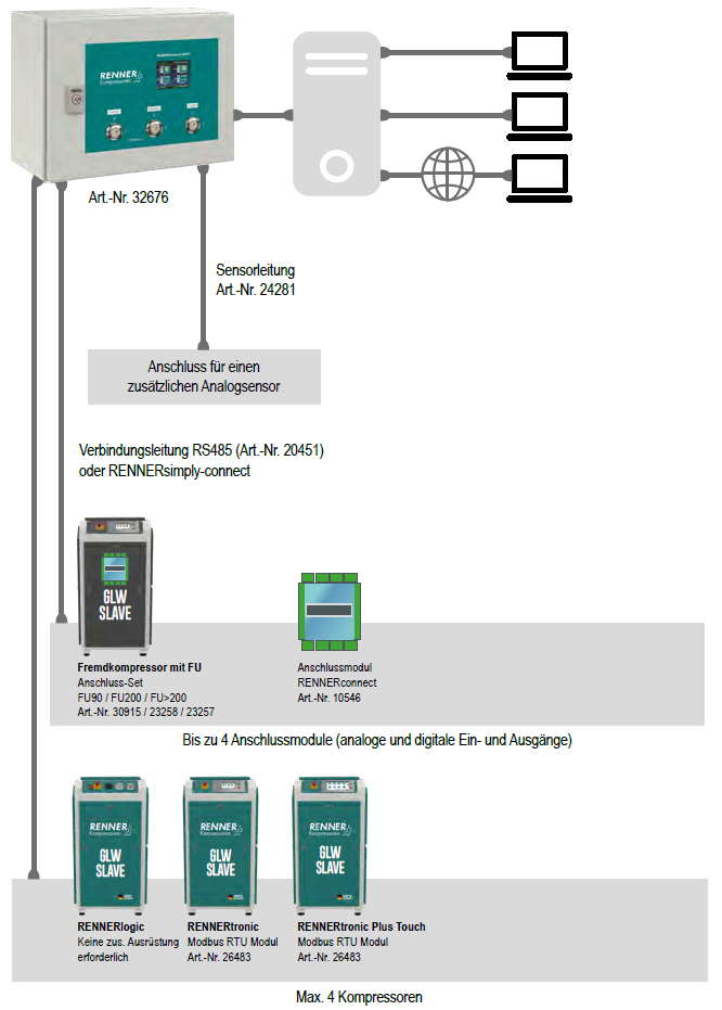 - Kompressoren mit der RENNERtronic, RENNERtronic Touch, RENNERtronic Plus, RENNERtronic Plus Touch oder RENNERlogic können direkt an die RENNERconnect angeschlossen werden.
